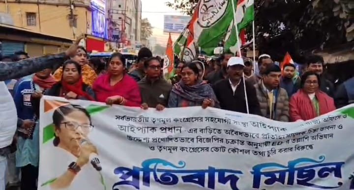 পার্থ খাঁড়া, আমাদের ভারত, পশ্চিম মেদিনীপুর, ৮ জানুয়ারি: কলকাতায় আই-প্যাকের অফিসে এনফোর্সমেন্ট ডিরেক্টরেট (ইডি)-এর হানার প্রতিবাদে এবং মুখ্যমন্ত্রী মমতা বন্দ্যোপাধ্যায়ের নির্দেশে মেদিনীপুর শহরে বিক্ষোভ মিছিল সংগঠিত করল তৃণমূল কংগ্রেস। শুক্রবার মেদিনীপুর শহরের তৃণমূল কংগ্রেসের জেলা কার্যালয় নান্নুর চক থেকে এই প্রতিবাদ মিছিল শুরু হয়।