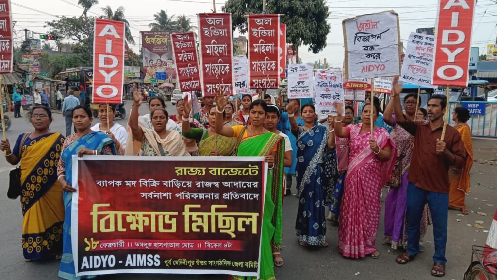 পার্থ খাঁড়া, আমাদের ভারত, পূর্ব মেদিনীপুর, ১৮ ফেব্রুয়ারি: সম্প্রতি রাজ্য বাজেটে ব্যাপক মদ বিক্রি বাড়িয়ে রাজস্ব আদায়ের সর্বনাশা পরিকল্পনার প্রতিবাদে আজ যুব সংগঠন অল ইন্ডিয়া ডেমোক্রেটিক ইয়ুথ অর্গানাইজেশন (এ আই ডি ওয়াই ও) এবং অল ইন্ডিয়া মহিলা সাংস্কৃতিক সংগঠন(এ আই এম এস এস)- এর পক্ষ থেকে তমলুক শহরে বিক্ষোভ মিছিল হয়। মিছিল শুরু হয় হাসপাতাল মোড়ের ক্ষুদিরাম মূর্তির পাদদেশ থেকে এবং শেষ হয় মাণিকতলা মোড়ের মাতঙ্গিনী হাজরার মূর্তির পাদদেশে। নেতৃত্ব দেন মহিলা সংগঠনের পক্ষে জেলা সম্পাদিকা প্রতিমা জানা, সভাপতি সিক্তা মাজী, যুব সংগঠনের রাজ্য সম্পাদক মন্ডলীর সদস্য স্নেহলতা সাউ ও জেলা সভাপতি মঞ্জুশ্রী মাইতি প্রমিখ।