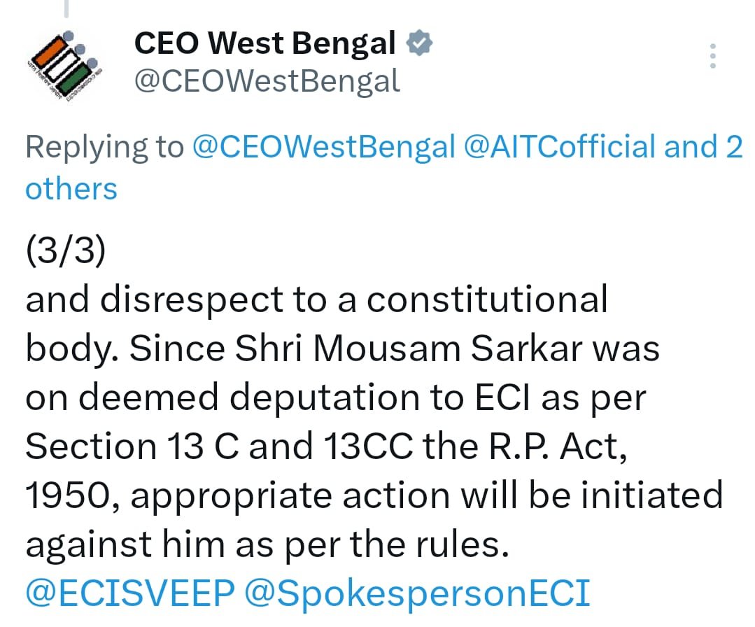কমিশনের তরফে জানানো হয়েছে, “যেহেতু মৌসম সরকার ১৯৫০ সালের জনপ্রতিনিধিত্ব আইনের ধারা ১৩ গ এবং ১৩ সিসি অনুসারে নির্বাচন কমিশনে সাময়িক দায়িত্বে ছিলেন, নিয়ম অনুসারে তাঁর বিরুদ্ধে যথাযথ ব্যবস্থা নেওয়া হবে।”