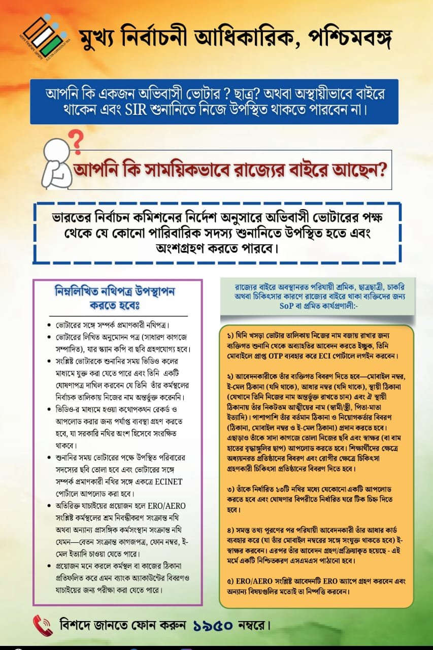 বুধবার জানা গিয়েছে, ভারতের নির্বাচন কমিশনের নির্দেশ অনুসারে অভিবাসী বা, সাময়িকভাবে রাজ্যের বাইরে থাকা ভোটদাতাদের পক্ষ থেকে কেউ, বা যে কোনও পারিবারিক সদস্য শুনানিতে উপস্থিত হতে এবং অংশগ্রহণ করতে পারবে। সঙ্গে নিম্নলিখিত নথিপত্র পেশ করতে বা কিছু বিধি মানতে হবে। সেগুলো হ’ল—