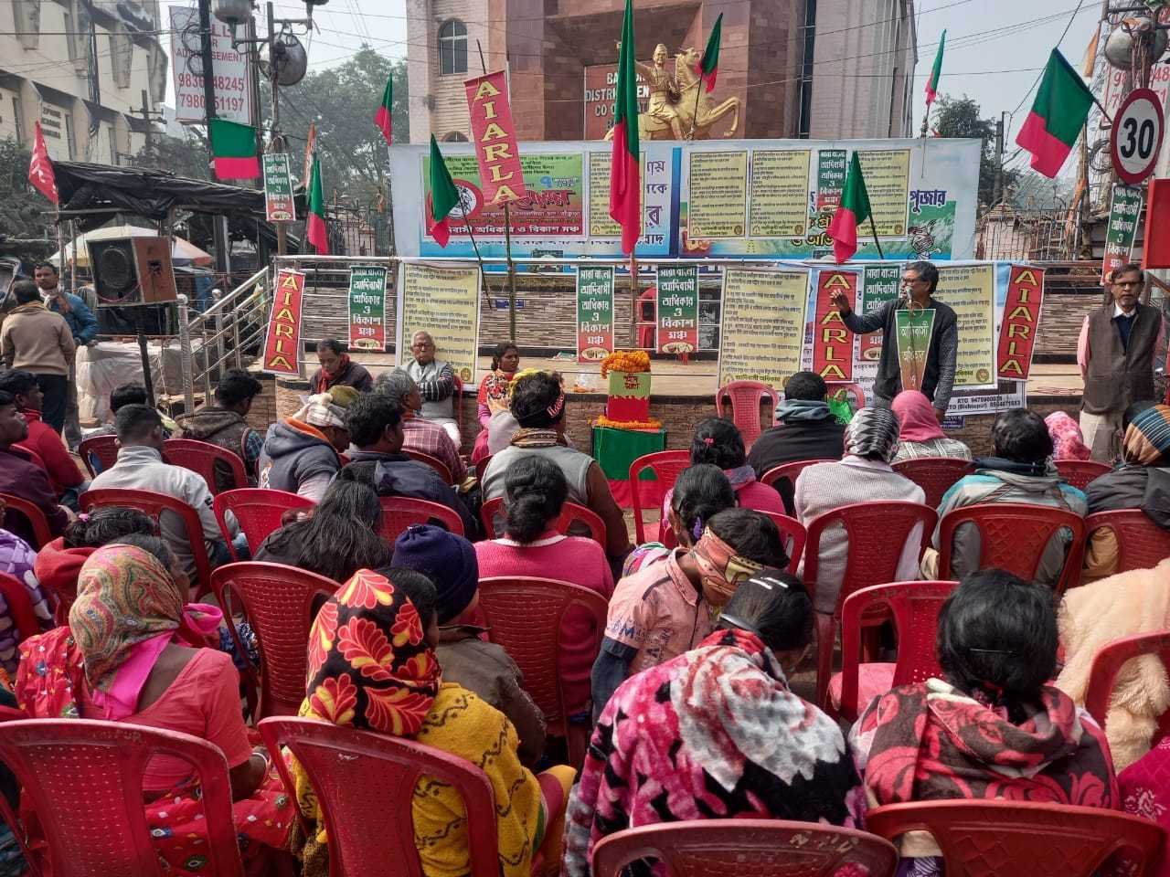 বিভিন্ন বক্তারা বলেন, সারা দেশে রাম মন্দিরের নামে এক ধর্মীয় উন্মাদনার সৃষ্টি করা হচ্ছে, রাজনৈতিক স্বার্থসিদ্ধির জন্য ধর্মকে কাজে লাগানো হচ্ছে। এটা দিনের আলোর মতো পরিষ্কার যে আসন্ন লোকসভা নির্বাচনের দিকে তাকিয়েই এই মন্দির উদ্বোধন করা হচ্ছে। প্রধানমন্ত্রী মোদী বলছেন “রামের জন্য ঘর” নাকি তৈরি হয়েছে! কিন্তু আবাস যোজনায় দেশের সকল গৃহহীনদের জন্য “পাক্কা মোকানের” প্রতিশ্রুতি আজও এক নিষ্ঠুর রসিকতা হয়েই রয়ে গেলো। বিশেষতঃ এই রাজ্যে প্রায় ১০ লক্ষ আবাস যোজনা উপভোক্তার বরাদ্দ টাকা আটকে রাখা হয়েছে। ২০০৬ সালের বনাঞ্চল অধিকার আইনকে নস্যাৎ করে দিয়ে আদিবাসীদের চিরাচরিত বনের জমি ও বাস্তু জমির পাট্টা দেওয়া হয়নি, সীমিত সংখ্যকের হলেও তাঁদের জমির পরচা বা রেকর্ড হয়নি। ফলে কাগজ না থাকার কারণে কেন্দ্র এবং রাজ্য সরকারের বিভিন্ন প্রকল্পের সমস্ত রকম সুবিধা থেকে তাঁরা বঞ্চিত থেকে যাচ্ছে। ভাগে বা চুক্তি প্রথায় আদিবাসীরা চাষাবাদ করে চলেছে, অথচ জমির মালিকরা চাষ না করেও ঘরে বসে দিব্যি সরকারি সুযোগ-সুবিধা পেয়ে যাচ্ছে। দীর্ঘ দু’বছর হতে চলল ১০০ দিনের কাজ এই রাজ্যে বন্ধ করে রাখা হয়েছে। এর কারণ হিসেবে রাজ্য সরকারের দুর্নীতির কথা বলা হচ্ছে। কিন্তু একজন দুর্নীতিগ্রস্ত নেতারও শাস্তি হয়নি। এমন কি এ বিষয়ে প্রশাসনে কোনো অভিযোগ পর্যন্ত দায়ের করা হয়নি। যাদের শাস্তি পাওয়ার কথা তারা দিনের আলোয় ঘুরে বেড়াচ্ছে, বাস্তবে শাস্তি পাচ্ছে এই রাজ্যের লক্ষ লক্ষ আদিবাসী, তপশিলি, দরিদ্র, ভূমিহীন, শ্রমজীবী মানুষরা।