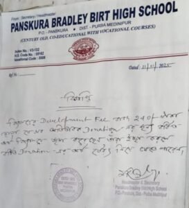 পার্থ খাঁড়া, আমাদের ভারত, পূর্ব মেদিনীপুর, ১১ জানুয়ারি: যেখানে সরকারি স্কুলে ভর্তির ফি ২৪০ টাকা, সেখানে পাঁশকুড়ার ঐতিহ্যবাহী বিদ্যালয় ব্রাডলি বার্ট হাইস্কুল কর্তৃপক্ষ ছাত্র-ছাত্রীদের থেকে জোরপূর্বক ভর্তি ফি নিচ্ছিলো ১৫০০ টাকা। এই ঘটনার তীব্র প্রতিবাদ জানিয়ে ভর্তিতে সরকার নির্ধারিত ফি’র অতিরিক্ত নেওয়া টাকা ফেরত সহ দুঃস্থ ছাত্র-ছাত্রীদের সম্পূর্ণ ফি মকুবের দাবি জানিয়ে ৮ জানুয়ারি বিদ্যালয়ের প্রধান শিক্ষককে স্মারকলিপি দেয় ছাত্র সংগঠন এআইডওএসও।