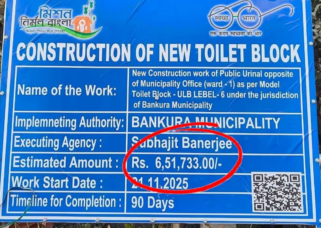 সোমনাথ বরাট, আমাদের ভারত, বাঁকুড়া, ৫ জানুয়ারি: বাঁকুড়া পৌরসভার একটি শৌচাগার নির্মাণ নিয়ে বিতর্কের ঝড় শহরজুড়ে। পুরসভার সামনে পুরনো একটি শৌচাগার ভেঙ্গে সেই জায়গায় দুই কক্ষের শৌচাগার নির্মাণ শুরু হতে চলেছে। এই নির্মাণ কাজের বিশদ তথ্য জানিয়ে একটি বোর্ড লাগানো হয়। এই বোর্ড লাগানোর পর থেকেই শহরজুড়ে বিতর্ক ছড়িয়ে পড়ে।