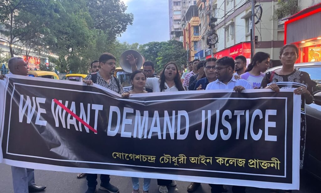 আমাদের ভারত, কলকাতা, ৯ সেপ্টেম্বর: আর জি কর-এ ঘটে যাওয়া পৈশাচিক কাণ্ডের পর এক মাস কেটে গেছে। মূল ঘটনার প্রতিবাদে এবং ‘বিচার চাই’ ধ্বনি তুলে যোগেশ চন্দ্র চৌধুরী আইন কলেজের প্রাক্তনী এবং আইনজীবীরা রবিবার সন্ধ্যায় প্রতিবাদ সভা করেন। এঁদের অধিকাংশই ছিলেন নবীন।