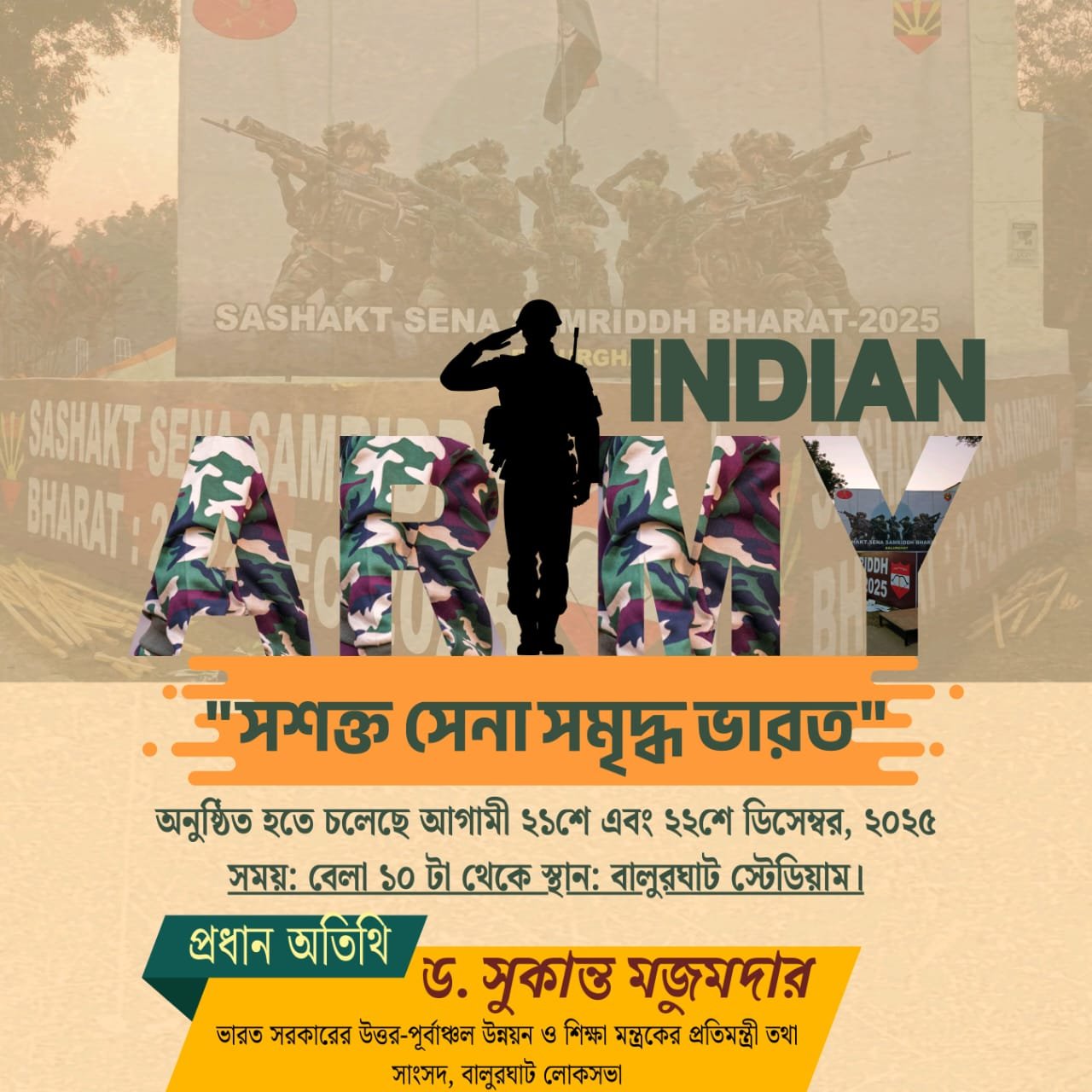 আমাদের ভারত, ১৯ ডিসেম্বর: বাংলাদেশের সঙ্গে উত্তপ্ত সম্পর্কের মাঝে সীমান্তে শক্তি প্রদর্শনের আয়োজন করল ভারতীয় সেনা। আগামী ২১ ও ২২ ডিসেম্বর বালুরঘাট স্টেডিয়ামে সশক্ত সেনা সমৃদ্ধ ভারত প্রদর্শনী অনুষ্ঠিত হতে চলেছে। এই অনুষ্ঠানে মুখ্য অতিথি হিসেবে উপস্থিত থাকবেন কেন্দ্রীয় মন্ত্রী সুকান্ত মজুমদার।