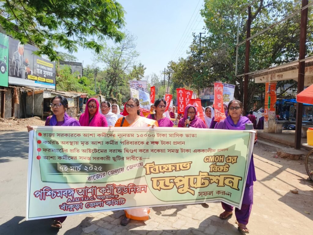 সোমনাথ বরাট, আমাদের ভারত, বাঁকুড়া, ৭ মার্চ: ভাতা বৃদ্ধি ও প্রতি মাসের নির্দিষ্ট সময় ভাতা দেওয়ার দাবিতে আজ বাঁকুড়া জেলা স্বাস্থ্য আধিকারিকের দপ্তরের সামনে আশা কর্মীরা বিক্ষোভ দেখায় ও ডেপুটেশন জমা দেয়। তাদের অভিযোগ, যে পরিমাণ টাকা তাদের ভাতা দেওয়া হয় তাতে চলে না সংসার, প্রতিমাসে দেনা করতে হয়। তার ওপর বেড়ে চলেছে বকেয়া।