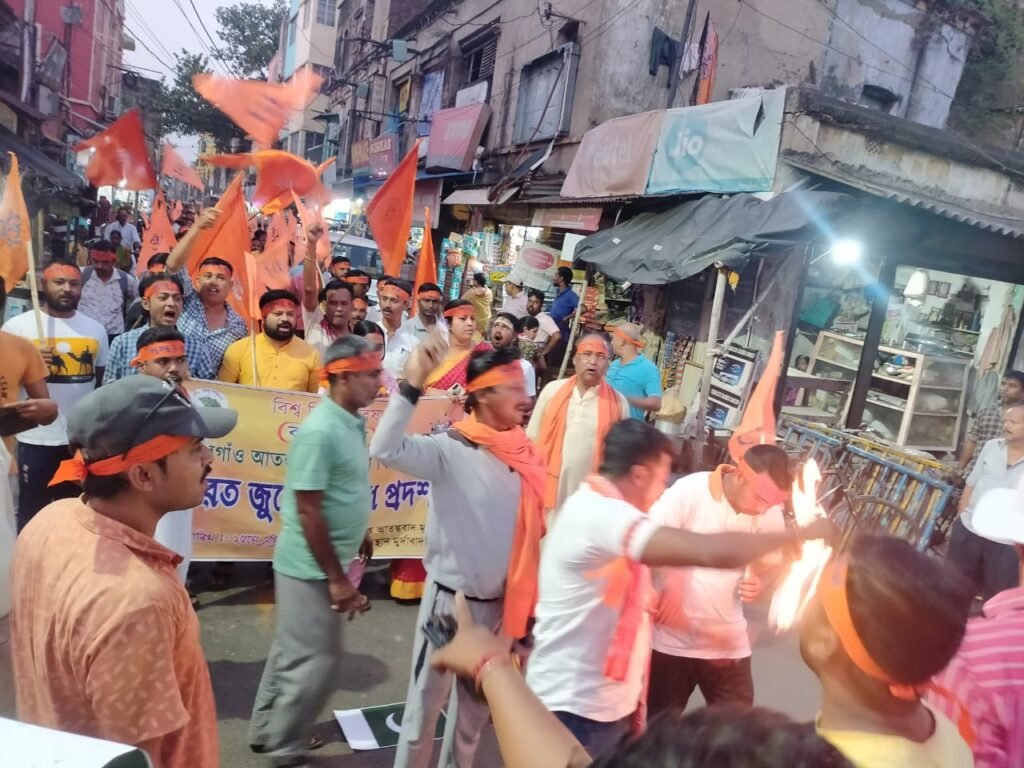 মাচানতলা মোড়ে পাকিস্তানের পতাকায় আগুন ধরিয়ে বিক্ষোভ দেখানো হয়।বিশ্ব হিন্দু পরিষদের বিভাগীয় কার্যকর্তা রনধীর মুখোপাধ্যায় বলেন, ইসলামী সন্ত্রাস নিয়ে নতুন করে কিছু বলার নেই, বিশ্বের প্রতিটি দেশই আজ ইসলাম সন্ত্রাসবাদের শিকার। ভারত তার বাইরে নয়। বিভিন্ন দেশে সন্ত্রাসীদের বিরুদ্ধে দলমত নির্বিশেষে একজোট হয়ে লড়াই করে আর ভারতবর্ষে সেকুলার রাজনৈতিক দলগুলো ভোটের লোভে প্রকারান্তরে মদত দেয়, এই কারণেই ভারতবর্ষে সন্ত্রাসীদের রমরমা। এখানে বেছে বেছে হিন্দুদের হত্যা করা হলেও সেকুলারবাদীরা তা স্বীকার করতে পারে না।সারা ভারতজুড়ে আজ বজরং দলের পক্ষ থেকে পেহেলগাঁও কান্ডের প্রতিবাদে বিক্ষোভ দেখানো হচ্ছে।
