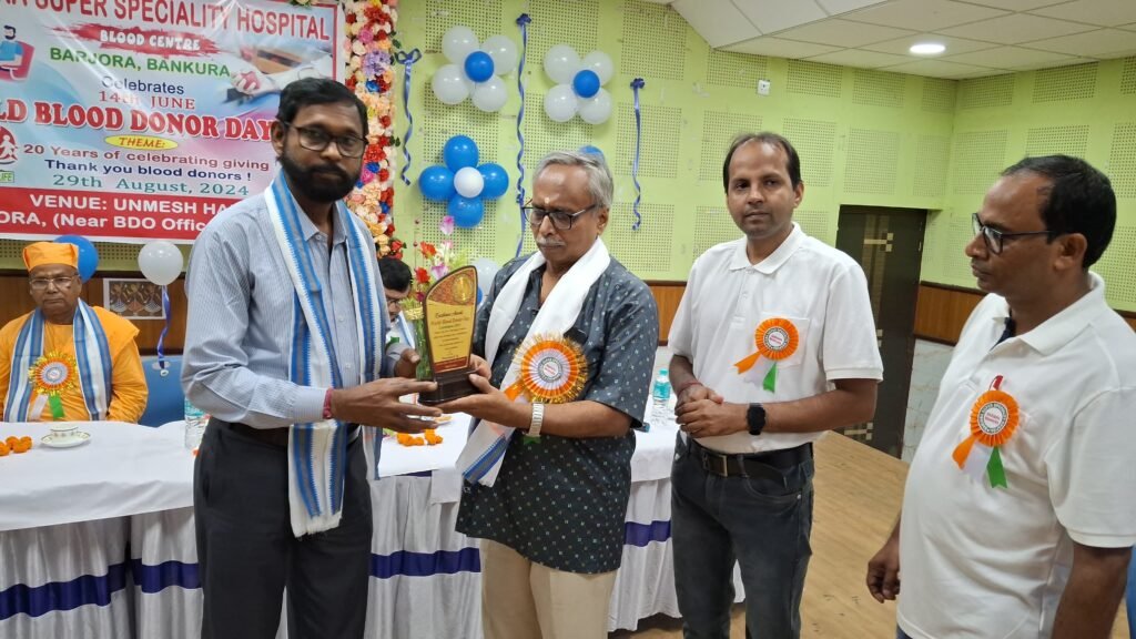 সোমনাথ বরাট, আমাদের ভারত, বাঁকুড়া, ২৯ আগস্ট: বড়জোড়া সুপার স্পেশালিটি হাসপাতালের ব্লাড ব্যাঙ্কে যারা ২৫ বা তারও বেশি বার রক্তদান করেছেন এবং যে সকল সংস্থা শিবির করে এই ব্লাড ব্যাঙ্কে রক্তের যোগান দিয়ে গেছেন তাদের বিশেষ সম্মান ও সংবর্ধনা জ্ঞাপন করা হয়। আজ বড়জোড়া উন্মেষ হলে এই উপলক্ষে আয়োজিত সংবর্ধনা সভায় উপস্থিত ছিলেন রামহরিপুর রামকৃষ্ণ মঠ ও মিশনের মহারাজ স্বামী মুক্তিপ্রদানন্দজী, বড়জোড়া সুপার স্পেশালিটি হাসপাতালের সুপার ডাঃ সোমনাথ নন্দী, আসানসোল ব্লাড ব্যাঙ্কের আধিকারিক ডা: সঞ্জীব চট্টোপাধ্যায়, বড়জোড়া ব্লাড ব্যাঙ্কের এমওআইসি ডা: পর্ণা ভৌমিক, জয়েন্ট বিডিও শুভঙ্কর সিংহ সহ বহু বিশিষ্ট ব্যক্তি।