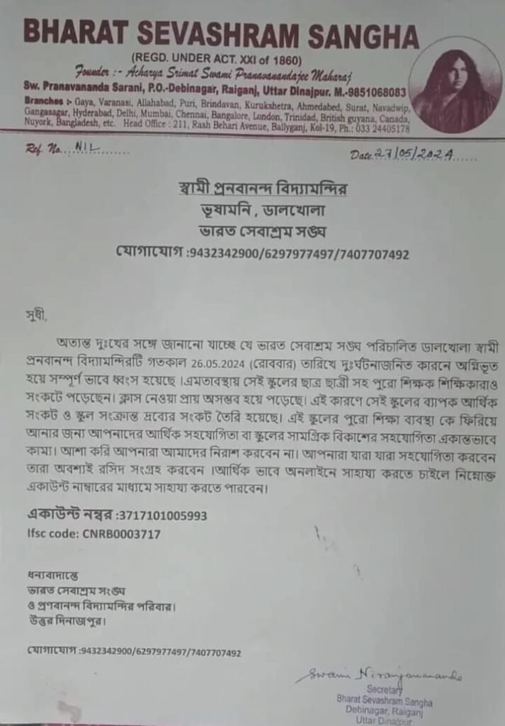 এদিকে আগুনে গোটা পুড়ে যাওয়ার পর ভারত সেবাশ্রম সংঘ ও প্রণবানন্দ বিদ্যা মন্দির পরিবার উত্তর দিনাজপুর শাখার তরফে জানানো হয়েছে, ডালখোলা প্রণবানন্দ বিদ্যামন্দির রবিবার আগুনে পুড়ে সম্পূর্ণভাবে ধ্বংস হয়েছে। ফলে এই স্কুলের ছাত্র-ছাত্রী ও শিক্ষক শিক্ষিকারাও সঙ্কটে পড়েছেন। ক্লাস নেওয়া প্রায় অসম্ভব হয়ে পড়েছে। এই মুহূর্তে স্কুলটি বড়সড় আর্থিক সঙ্কট ও স্কুল চালানোর জন্য প্রয়োজনীয় বিভিন্ন জিনিসের সঙ্কট দেখা দিয়েছে। স্কুলের পুরো শিক্ষা ব্যবস্থাকে ফিরিয়ে আনার জন্য তারা আর্থিক সাহায্য চেয়েছেন সাধারণ মানুষের কাছে। অনলাইনের মাধ্যমেও সাহায্য তারা নেবেন বলে জানিয়েছেন। সেক্ষেত্রে তারা একটি অ্যাকাউন্ট নম্বার দিয়েছেন। অ্যাকাউন্ট নম্বর-