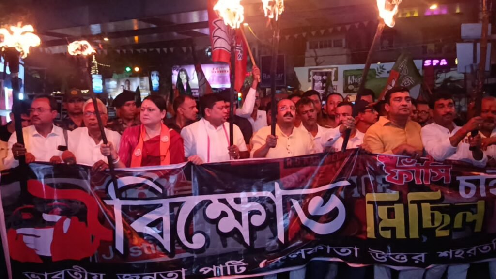 আমাদের ভারত, ১৮ সেপ্টেম্বর: সোমবার ধর্না মঞ্চ থেকে সুকান্ত মজুমদার ঘোষণা করেছেন আর জি কর কান্ডের বিচারের দাবিতে তাদের আন্দোলন কর্মসূচি লাগাতার চলবে। সেই মতো বুধবার একেবারে পথে নেমে মশাল মিছিল করে আন্দোলন শুরু করে দিল পদ্ম শিবির। আজ নাগের বাজার থেকে দমদম স্টেশন পর্যন্ত বিজেপির প্রতিবাদী মশাল মিছিল হয়।