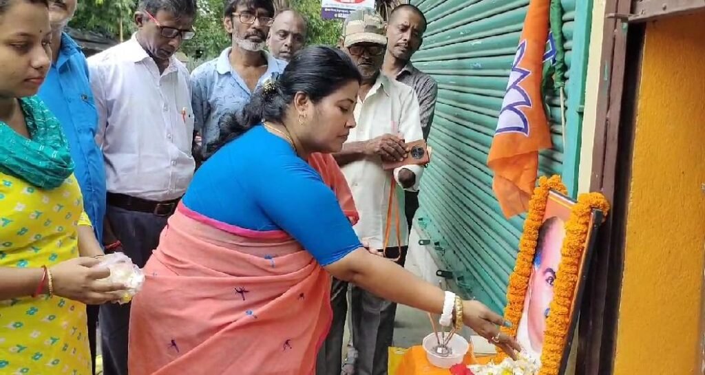 আমাদের ভারত, উত্তর ২৪ পরগণা, ৬ জুলাই: আজ ভারত কেশরী শ্যামাপ্রসাদ মুখার্জির জন্মদিন। রাজ্যের বিভিন্ন জায়গায় ভারত কিশোরীকে সম্মান জানাচ্ছেন দলীয় কর্মী সমর্থক থেকে সাধারণ মানুষ। আজ সকালে ভাটপাড়ার কালীমন্দির সংলগ্ন এলাকায় শ্যামাপ্রসাদ মুখার্জির ছবিতে মালা দিয়ে তাকে সম্মান জানান বিজেপির মহিলা মোর্চার সভানেত্রী ফাল্গুনী পাত্র।