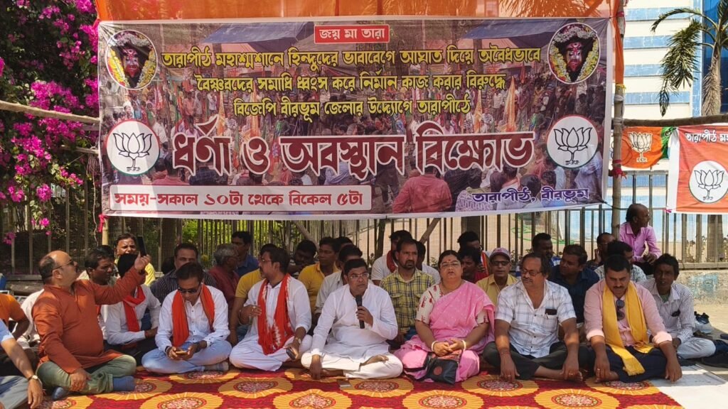 আশিস মণ্ডল, আমাদের ভারত, রামপুরহাট, ৯ মার্চ: গাজোয়ারি করে তারাপীঠ মহাশ্মশানে তৈরি হচ্ছে নোংরা জল মজুত করার কংক্রিটের স্থায়ী নির্মাণ। প্রতিবাদে এবার লাগাতার আন্দোলনে নামলো বিজেপি। এবার তারাপীঠ-রামপুরহাট উন্নয়ন পর্ষদের কার্যালয়ের সামনে অস্থায়ী মঞ্চ তৈরি করে অবস্থান বিক্ষোভ শুরু করল বীরভূম জেলা বিজেপি। রবিবার থেকে তিন দিনের জন্য অবস্থান বিক্ষোভে বসলেন বিজেপি কর্মী ও সমর্থকরা।