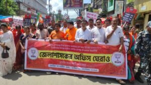 মিছিল মেইন রোড ধরে শহরের একাংশ ঘুরে কোর্ট রোড সংযোগ স্থলে আসতেই সেখানে মুখ্যমন্ত্রীর কুশপুতুল পোড়ান বিজেপি নেতা কর্মীরা। পুলিশ জল ঢেলে আগুন নেভাতে গিয়ে বিজেপি নেতা কর্মীদের বাধার মুখে পড়ে। তার পরই দুই পক্ষের মধ্যে ধস্তাধস্তি পরিস্থিতি তৈরি হয়। চলে বচসা। উত্তেজিত অবস্থায় দেখা গিয়েছিল বিজেপি নেতাদের। কোর্ট রোড দিয়ে ফের মিছিল কাছারি রোড দিয়ে জেলা শাসকের কার্যালয়ের সামনে পুলিশের ব্যারিকেড ভেঙে এগিয়ে দ্বিতীয় ব্যারিকেড পৌঁছাতেই উত্তপ্ত হয়ে উঠে ঘটনাস্থল।