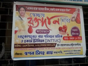 পার্থ খাঁড়া, আমাদের ভারত, পশ্চিম মেদিনীপুর, ২৩ ডিসেম্বর: ব্লাড ব্যাঙ্কে রক্তের চাহিদা মেটানোর লক্ষ্যে সোমবার পশ্চিম মেদিনীপুর জেলার গড়বেতা তিন নম্বর ব্লকের চন্দ্রকোনা রোড সেন্ট্রাল বাস স্ট্যান্ড অফিস প্রাঙ্গনে বাস পরিবহন শ্রমিক ও হকার্স ইউনিয়নের যৌথ উদ্যোগে রক্তদান শিবিরের আয়োজন করা হয়। এদিন এই রক্তদান শিবিরে প্রায় ৪১ জন রক্ত দাতা রক্ত দান করেন বলে জানিয়েছেন ব্লক আইএনটিটিইউসি’র সভাপতি দেব কুমার দে।