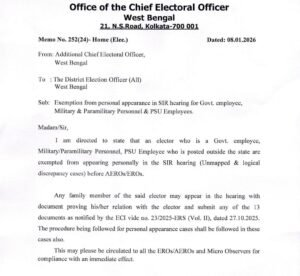 অশোক সেনগুপ্ত, আমাদের ভারত, ৮ জানুয়ারি: নির্দিষ্ট কিছু শ্রেণির ভোটদাতাকে এসআইআর-এর শুনানীতে ব্যক্তিগত উপস্থিতি থেকে [...]