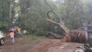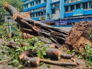 গতকাল বৃহস্পতিবার রাত থেকে প্রবল বৃষ্টিপাত শুরু হয় ঝাড়গ্রাম জেলাজুড়ে। বৃষ্টির দরুন বৃহস্পতিবার সকালে ঝাড়গ্রাম শহরের জেলাশাসকের অফিস সংলগ্ন ট্রেজারি বিল্ডিংয়ের পাশে রাস্তার পাশে থাকা একটি শতাব্দী প্রাচীন বট গাছ মাটি উপড়ে রাস্তার উপর পড়ে যায়। শতাব্দী প্রাচীন বট গাছের ডালপালার আয়তন বিশাল থাকায় সুভাষ পার্কের মোড় থেকে জেলখানা মোড় যাওয়ার রাস্তা পুরোপুরি বন্ধ হয়ে যায়। রাস্তার পাশে থাকা বিদ্যুতের পিলার ভেঙ্গে গিয়ে বিদ্যুৎ সংযোগ বিচ্ছিন্ন হয়ে যায় এলাকায়। বৃহস্পতিবার প্রশাসনের তৎপরতায় শতাব্দী প্রাচীন বট গাছের ডালপালা কেটে রাস্তাটিকে সচল করা হয়। কিন্তু শতাব্দী প্রাচীন বট গাছের কান্ডের আয়তন বিশাল হওয়ায় বট গাছটিকে শেষ পর্যন্ত কাটতে পারেনি প্রশাসনের নিযুক্ত করা কর্মচারীরা।