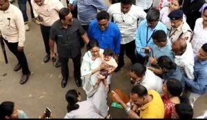 পার্থ খাঁড়া, আমাদের ভারত, পশ্চিম মেদিনীপুর, ৪ মার্চ: পূর্ব মেদিনীপুরের তমলুক থেকে পশ্চিম মেদিনীপুরের মেদিনীপুর শহরে পৌঁছলেন মুখ্যমন্ত্রী মমতা বন্দ্যোপাধ্যায়। সোমবার বেলা ২টো ৪৫- এ মেদিনীপুর শহরের বিধাননগরের মাঠে অস্থায়ী হেলিপ্যাডে অবতরণ করে মুখ্যমন্ত্রীর কপ্টার। তাঁর জন্য গাড়ির ব্যবস্থা থাকলেও, মুখ্যমন্ত্রী পায়ে হেঁটেই রওনা দেন মাত্র কয়েকশো মিটার দূরে অবস্থিত সার্কিট হাউসের দিকে। মুখ্যমন্ত্রীকে দূর থেকে এক ঝলক দেখার জন্য রাস্তার দু’পাশে ভিড় জমিয়েছিলেন অসংখ্য মানুষ। তবে মহিলাদের সংখ্যাই ছিল বেশি। তাঁদের মধ্যেই এক মহিলার কোলে এক শিশুকে দেখে মুখ্যমন্ত্রী হাত বাড়িয়ে দেন। এরপর শিশুটিকে কোলে নিয়ে বেশ কিছুক্ষণ আদর করার পর পুনরায় তার মায়ের কোলে ফিরিয়ে দেন।