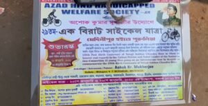 পার্থ খাঁড়া, আমাদের ভারত, পশ্চিম মেদিনীপুর, ২২ জানুয়ারি: রাত পোহালেই দেশের বীর বিপ্লবী সন্তান তথা মহান নেতা নেতাজী সুভাষচন্দ্র বসুর ১২৯তম জন্মবার্ষিকী পালন করা হবে সারা দেশে। ভারত মাতার এই অবিসংবাদিত নেতার প্রতি শ্রদ্ধাঞ্জলি নিবেদন করতে আজাদ হিন্দ হ্যান্ডিক্যাপ ওয়েলফেয়ার সোসাইটির পরিচালনায় অশোক মুখার্জির উদ্যোগে মেদিনীপুর থেকে পুরুলিয়া পর্যন্ত ২৯তম সাইকেল যাত্রার আয়োজন করা হয়েছে।