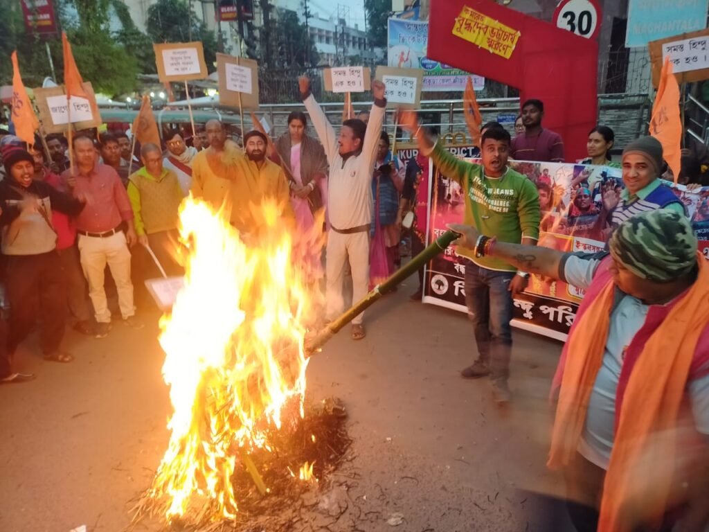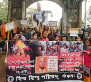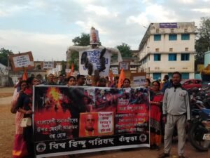 বাংলাদেশে সাম্প্রতিক নির্বিচারে হিন্দু হত্যা, ঘরবাড়ি লুটপাট, মন্দিরে হামলা, মূর্তি ভাঙ্গচুর ইত্যাদির ঘটনা জনসমক্ষে আসতেই জনমানসে চাপা ক্ষোভ সৃষ্টি হয়েছে। তার উপর এই সব ঘটনার প্রতিকার চেয়ে বাংলাদেশে সনতনীদের নেতৃত্বে ইসকন সন্ন্যাসী চিন্ময় প্রভুকে গ্রেফতার করা হয়েছে। এই ঘটনার প্রতিবাদে বিশ্বহিন্দু পরিষদের উদ্যোগে আজ এক বিক্ষোভ মিছিলের আয়োজন করা হয়। প্রায় দুই শতাধিক জনতা বঙ্গবিদ্যালয় মাঠ থেকে মিছিল করে শহর পরিক্রমা করে। মিছিলে মহিলাদের উপস্থিতি ছিল নজরে পড়ার মতো।মাচানতলা মোড়ে মিছিল উপস্থিত হলে সেখানে মহম্মদ ইউনুসের কুশপুত্তলিকা দাহ করা হয়।