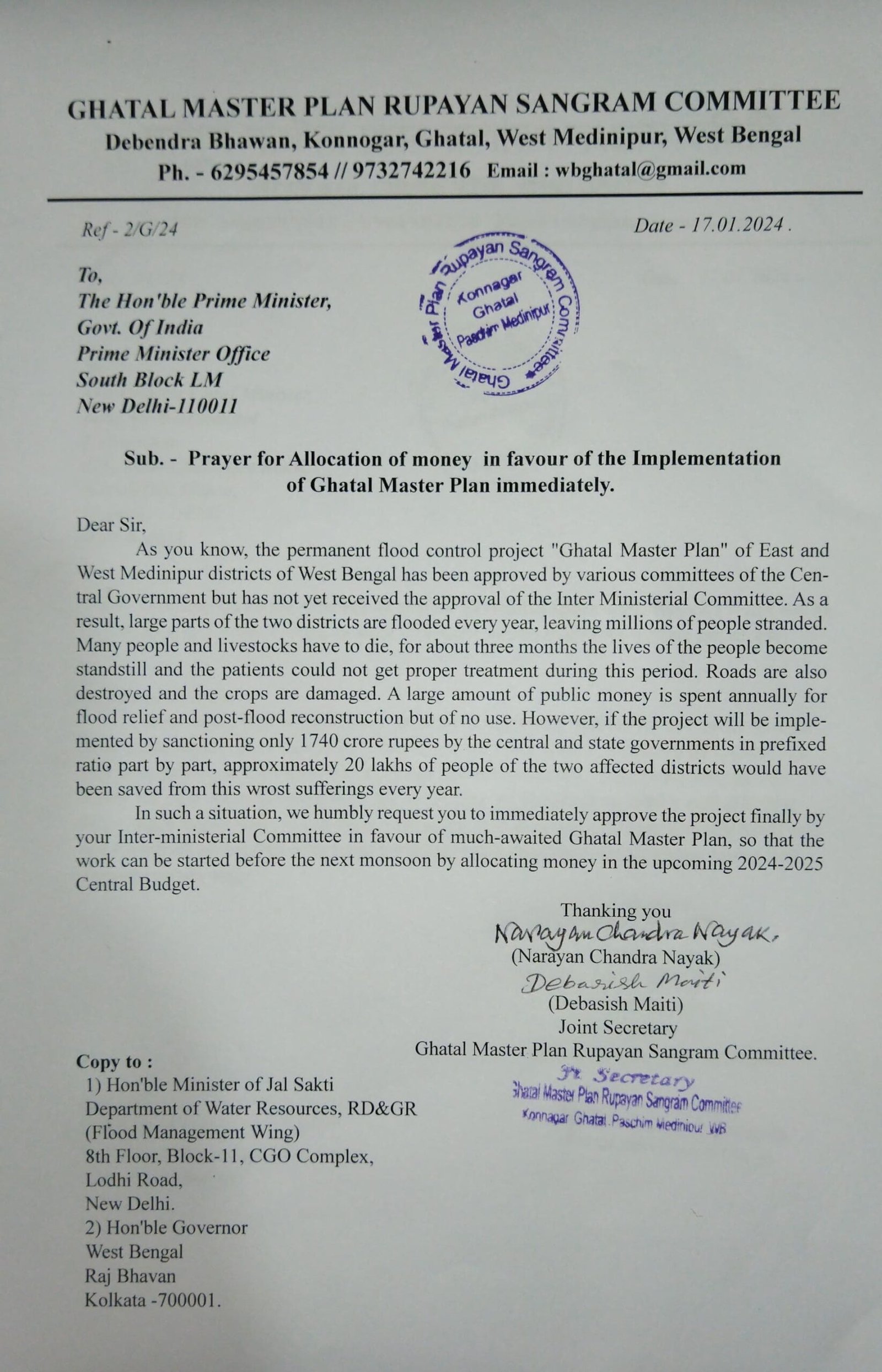 পার্থ খাঁড়া, আমাদের ভারত, পশ্চিম মেদিনীপুর, ১৭ জানুয়ারি: পশ্চিমবঙ্গের বহু প্রতিক্ষিত ঘাটাল মাস্টার প্ল্যান রূপায়নের ক্ষেত্রে অবিলম্বে কেন্দ্রের ইন্টার মিনিস্টিরিয়াল কমিটির ছাড়পত্র দিয়ে আসন্ন বাজেটে অর্থ বরাদ্দ এবং আগামী বর্ষার আগে কাজ শুরুর দাবি ঘাটাল মাস্টার প্ল্যান রূপায়ন সংগ্রাম কমিটির। এই দাবিতে প্রধানমন্ত্রী নরেন্দ্র মোদী ও কেন্দ্রীয় সরকারের জলশক্তিমন্ত্রকের ভারপ্রাপ্ত মন্ত্রী গজেন্দ্র সিং শেখাওয়াতের কাছে ই- মেইলে স্মারকলিপি দেওয়া হয়।