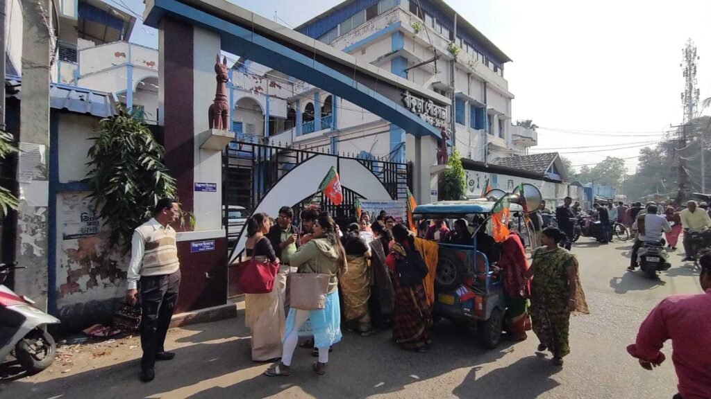 সোমনাথ বরাট, আমাদের ভারত, বাঁকুড়া, ১১ ডিসেম্বর: বাকুড়া পৌর এলাকার নতুনচটি’তে শিক্ষক ও তার পুত্র হত্যায় প্রকারন্তরে পৌরসভাকে দায়ী করে আজ পৌরসভায় বিক্ষোভ প্রদর্শন করে বিজেপি মহিলা মোর্চা।আজ সকালে মহিলা মোর্চার রাজ্য নেত্রী মিতা চ্যটার্জির নেতৃত্বে শতাধিক মহিলা মিছিল করে পৌরসভায় বিক্ষোভ দেখায় ।মিতাদেবী বলেন, শিক্ষক মহাশয়ের জমি দখল করে অভিযুক্ত পিন্টু রুইদাস আবাস যোজনায় বাড়ি তৈরির ছাড়পত্র পেল কীভাবে? পৌরসভা যদি এভাবে ছাড়পত্র না দিত তা হলে এভাবে শিক্ষক মহাশয় ও তার পুত্রের মৃত্যু ঘটতো না।কাজেই এই হত্যা কাণ্ডের দায় এড়াতে পারে না পৌরসভা।