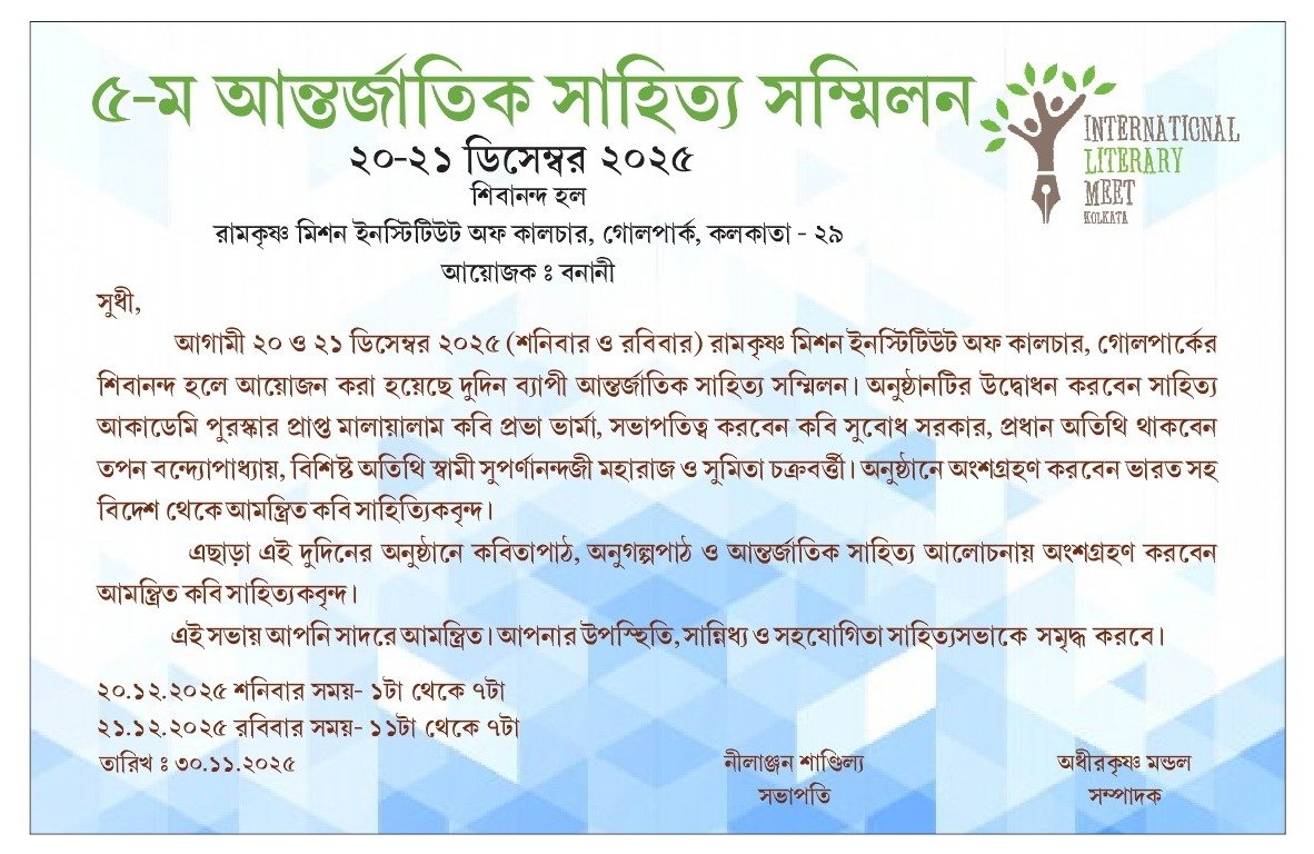 আমাদের ভারত, কলকাতা, ১৯ ডিসেম্বর: শনিবার থেকে ‘বনানী’ পত্রিকার পরিচালনায় অনুষ্ঠিত হতে চলেছে পঞ্চম আন্তর্জাতিক সাহিত্য সম্মেলন, কলকাতা। প্রথম সম্মেলন অনুষ্ঠিত হয়েছিল ১৯১৮ সালে। পর পর তিন বছর অনুষ্ঠান হওয়ার পর করোনা অতিমারীর জন্য তিন বছর অনুষ্ঠান বন্ধ রাখতে হয়। তারপর তা আবার শুরু হয় গত বছর ২০২৪ থকে।
