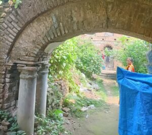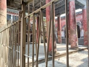 পাশে নিস্তব্ধ বিশাল প্রসাদ। যে কেউ তাকিয়ে থাকবেন চিত্রার্পিতের মতো। আমি তাতেই ক্ষান্ত হলাম না। নিজেরও একটা ছবি তুলিয়ে রাখলাম। সঙ্গে অবশ্যই বাড়িটির নানা অংশের ছবি। এই প্রাসাদ এবং মিত্র পরিবার সম্পর্কে প্রচুর লেখালেখি হয়েছে। সত্যিই যেন রূপকথা। তবে আজ আর সেগুলোর পুনরুক্তিতে গেলাম না।