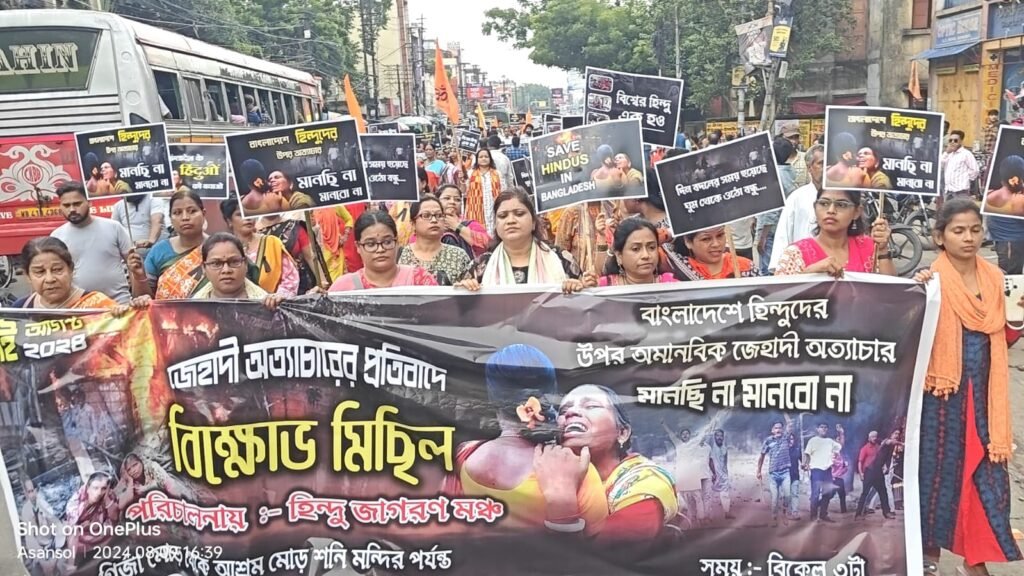 বাংলাদেশের হিন্দুদের উপর জেহাদি অত্যাচার মানব না। এই স্লোগান তুলেই শুক্রবার হিন্দু জাগরণ মঞ্চের উদ্যোগে আসানসোল একটি বিরাট প্রতিবাদ মিছিল হয়। এই মিছিলে নেতৃত্ব দেন হিন্দুত্ববাদী একাধিক নেতা। আসানসোলের গীর্জা মোড় থেকে এই মিছিলটি শুরু হয়, শেষ হয় আশ্রম মোড়ে।