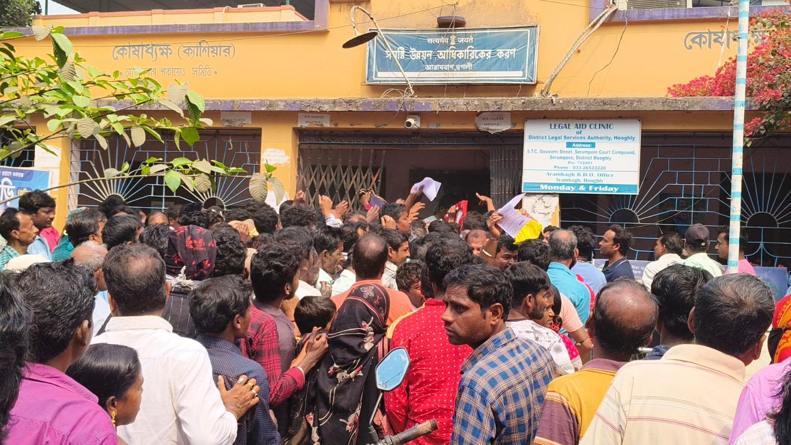 গোপাল রায়, আমাদের ভারত, আরামবাগ, ২৩ ফেব্রুয়ারি: যুবসাথী থেকে ভূমিহীনদের ফর্ম তোলার লাইনে ব্যাপক উত্তেজনা ছড়িয়ে পড়লো আরামবাগ বিডিও অফিস চত্বরে। হাজার হাজার মানুষের ভিড়ে ব্যাপক বিশৃঙ্খলার সৃষ্টি হয়। ঠেলাঠেলি, ধস্তাধস্তি, এমনকি ফর্ম কাড়াকাড়িও শুরু হয়ে যায়। ভিড়ের কারণে রীতিমতো প্রাণ ওষ্ঠাগত হওয়ার জোগাড় হয়। ফর্ম নিয়ে কাড়াকাড়ি, ধস্তাধস্তিতে অনেকেই অসুস্থ বোধ করেন। এমনই পরিস্থিতি তৈরি হয় যে সেখানে থাকা পুলিশও ঘটনা সামাল দিতে পারেনি।