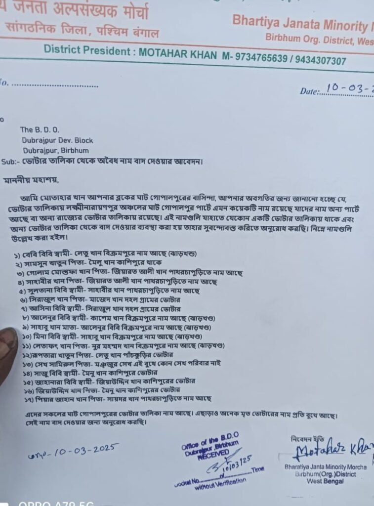 বিজেপির বীরভূম জেলা সংখ্যালঘু মোর্চার সভাপতি মোতাহার খান বলেন, “২০২৪ সালে আমি ওই সমস্ত ভোটারের নাম লিখিত আকারে বাদ দেওয়ার জন্য বিডিওকে জানিয়েছিলাম। এবার ভুয়ো পরিচয়পত্রের নম্বর পর্যন্ত দিলাম। এরপরেও যদি নাম বাদ না যায় তাহলে আমরা বৃহত্তর আন্দোলনে নামবো।”