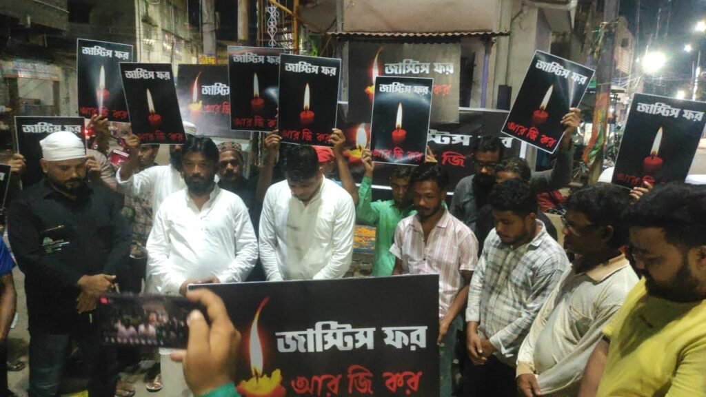 পুরুলিয়া শহরের ট্যাক্সি স্ট্যান্ডে পথচারীদের ‘উই ওয়ান্ট জাস্টিস ‘ লেখা কালো রঙের রাখি পরিয়ে দিলেন প্রতিবাদী মহিলারা। সোমবারের বিকেল শোকাচ্ছন্ন হয়ে পড়ে পুরুলিয়া শহরের সবচেয়ে ব্যস্ততম ট্যাক্সি স্ট্যান্ডের কাছে মেইন রোড। বিভিন্ন ক্ষেত্রের মানুষ বিভিন্ন এলাকায় প্রতিবাদে গর্জে ওঠে এদিনও। পুরুলিয়া শহরের নীলকুঠি ডাঙ্গা এলাকায় হয় মানব বন্ধন। সেখানেও সন্ধ্যায় মোমবাতি জ্বালিয়ে বিচার চাইলেন তরুণীরা।পুরুলিয়া শহরের কসাই মহল্লা মোড়ে সন্ধ্যায় মোমবাতি জ্বালিয়ে মৃতার হত্যার বিচার চাইল ছোটরা।