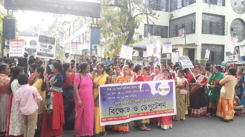 আমাদের ভারত, জলপাইগুড়ি, ২০ ডিসেম্বর: সম কাজে সম বেতন সহ একাধিক দাবি তুলে আন্দোলনে নামলো জলপাইগুড়ি সারা বাংলা মিড ডে মিল কর্মী ইউনিয়নের মহিলারা। বুধবার শহরের মাদ্রাসা মাঠে জমায়েত হয়ে শহরের বিভিন্ন প্রান্তে মিছিল করে জেলাশাসক দফতরে সামিল হলেন তারা। জেলাশাসক দফতরের সামনে পুলিশ ব্যারিকেড দিয়ে আন্দোলনকারীদের আটকে দেয়। সেখানে মিড ডে মিলের মহিলা কর্মীরা বিক্ষোভ দেখায়। এরপর জেলাশাসক দফতরে নিজেদের দাবিপত্র তুলে দেন ইউনিয়নের নেত্রীরা।