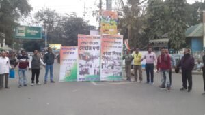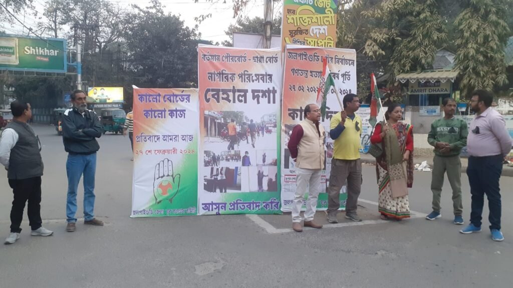 আমাদের ভারত, জলপাইগুড়ি, ২৭ ফেব্রুয়ারি: ২০২২ সালে ২৭ ফেব্রুয়ারি একাধিক জায়গার সঙ্গে জলপাইগুড়িতেও পুরভোট হয়। কংগ্রেসের অভিযোগ, পুরভোটকে কেন্দ্র করে জলপাইগুড়িতে গণতন্ত্রকে হত্যা করা হয়েছিল দুই বছর আগে। তাই আজ কালা দিবস পালন করলো জেলা যুব কংগ্রেস। থানা মোড়ে জমায়েত হয়ে ভোটের দিন ভোট লুট ও সন্ত্রাসের ছবি ব্যানারের মাধ্যমে তুলে ধরলেন নেতা কর্মীরা। সেখানে দলের নেতারা পুর ভোটের দিনের ঘটনা তুলে ধরলেন। সামনে লোকসভা ভোটে, এই তৃণমূলের ছাপ্পা ভোটের জবাব দেওয়ার আওয়াজ তুললেন নেতারা।