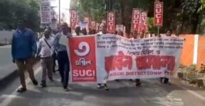 আমাদের ভারত, জলপাইগুড়ি, ৩ এপ্রিল: নিত্য প্রয়োজনীয় সামগ্রীর অস্বাভাবিক মূল্যবৃদ্ধি ও বেকারত্বের বিরুদ্ধে প্রতিবাদ জানিয়ে আইন অমান্য কর্মসূচিতে সামিল হলো এসইউসিআই- এর জলপাইগুড়ি জেলা কমিটি। বৃহস্পতিবার শহরে মিছিল করে জেলাশাসকের দফতরে আইন অমান্য কর্মসূচি শুরু করেন দলের নেতা কর্মীরা। যদিও কোতোয়ালি থানায় বিশাল পুলিশ বাহিনীর উপস্থিতিতে লোহার ব্যারিকেড দিয়ে আন্দোলনকারীদের আটকে দেওয়া হয়। রাস্তায় দাঁড়িয়ে এসএউসিআই নেতা কর্মীরা বিক্ষোভ ও প্রতিবাদ শুরু করেন। পাশাপাশি এসএসসি’র নিয়োগ প্রক্রিয়া বাতিল হওয়ায় রাজ্য সরকারের বিরুদ্ধে প্রতিবাদ জানান তাঁরা। চাকরিহারাদের পূর্নবহাল রাখারও দাবি তোলে কমিটি।