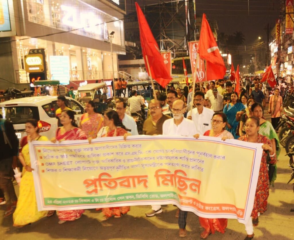 আমাদের ভারত, জলপাইগুড়ি, ২৫ এপ্রিল: শিক্ষক ও শিক্ষা কর্মীদের নিয়োগের ঘটনায় তৃণমূলের রাজ্য সরকারের দুর্নীতি প্রকাশ্যে এসেছে। বৃহস্পতিবার তার প্রতিবাদে জলপাইগুড়ির রাস্তায় নামল বামেরা। শহরে প্রতিবাদ মিছিলের মধ্যে দিয়ে রাজ্যের মুখ্যমন্ত্রী মমতা বন্দ্যোপাধ্যায়ের পদত্যাগের দাবি তুলে মিছিলেন হাঁটলেন বাম নেতা কর্মীরা।