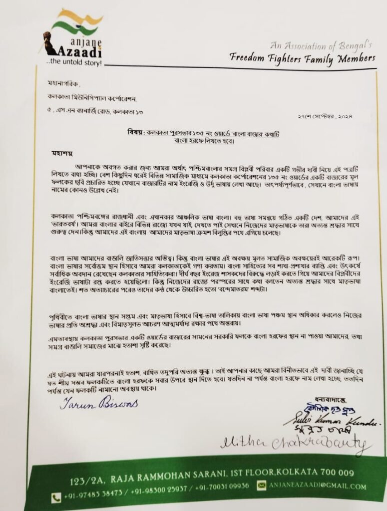 চিঠিতে লেখা হয়েছে, আমরা অর্থাৎ পশ্চিমবাংলার সমগ্র বিপ্লবী পরিবার একটি গভীর দাবি নিয়ে এই পত্রটি লিখতে বাধ্য হচ্ছি। বেশ কিছুদিন ধরেই বিভিন্ন সামাজিক মাধ্যমে কলকাতা কর্পোরেশনের ১৩৫ নং ওয়ার্ডের একটি বাজারের মূল ফলকের ছবি প্রচারিত হচ্ছে যেখানে বাজারটির নাম ইংরেজি ও উর্দু ভাষায় লেখা আছে। তাৎপর্য্যপূর্ণভাবে, সেখানে বাংলা ভাষায় নামের কোনও উল্লেখ নেই।