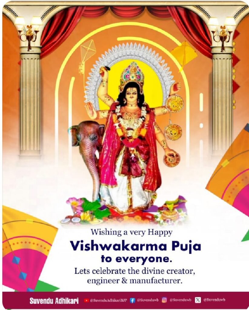 অন্যদিকে, বিরোধী দলনেতা শুভেন্দু অধিকারী লিখেছেন, “শুভ বিশ্বকর্মা পূজা উপলক্ষে শুভেচ্ছা জানাই। ভগবান বিশ্বকর্মা, ঐশ্বরিক কারিগর, স্থপতি এবং বিস্ময়ের স্রষ্টা সকলকে সমৃদ্ধি, সৃজনশীলতা এবং সাফল্যের আশীর্বাদ বর্ষণ করুন।”