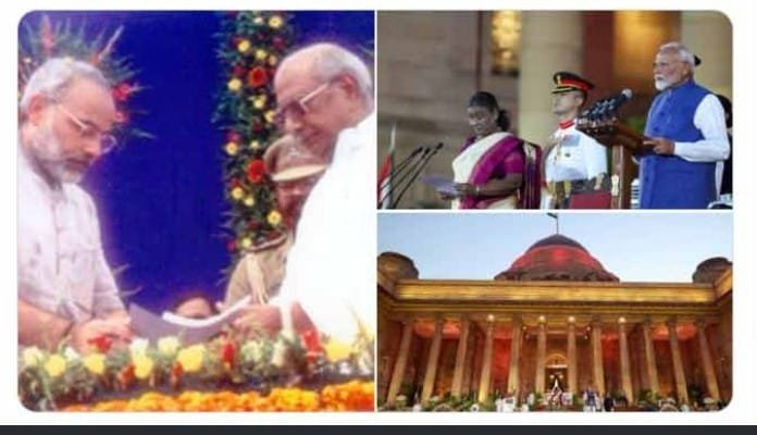 ২৪ বছর আগে গুজরাটের মুখ্যমন্ত্রী হিসেবে শপথ নেওয়ার ছবি পোস্ট করেছেন প্রধানমন্ত্রী। এরপর তিনবার প্রধানমন্ত্রী হিসেবে শপথ গ্রহণের ছবিও পোস্ট করেছেন তিনি। একই সঙ্গে আঙুল তুলেছেন পূর্বতন কংগ্রেস নেতৃত্বাধীন ইউপিএ সরকারের দিকেও।
