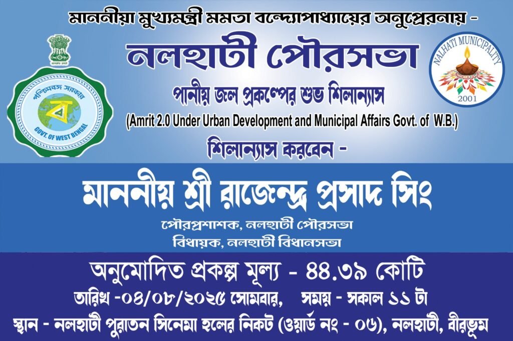 প্রসঙ্গত, সোমবার নলহাটি পুরসভা এলাকায় ৪৪ কোটি ৩৯ লক্ষ টাকা ব্যয়ে পানীয় জল প্রকল্পের শিলান্যাস হতে চলেছে। শিল্যানাস করবেন নলহাটি পুরসভার প্রশাসক তথা বিধায়ক রাজেন্দ্র প্রসাদ সিং। এই মর্মে শহরের বিভিন্ন জায়গায় পোস্টার দেওয়া হয়েছে। বাড়ি বাড়ি বিলি করা হচ্ছে আমন্ত্রন পত্র। সেই পোস্টারে লেখা রয়েছে, ‘মাননীয় মুখ্যমন্ত্রী মমতা বন্দ্যোপাধ্যায়ের অনুপ্রেণায় নলহাটি পুরসভার পানীয় জল প্রকল্পের শুভ শিলান্যাস। নলহাটি পুরসভার ৬ নম্বর ওয়ার্ডের পুরাতন সিনেমা হলের নিকট ওই প্রকল্পের শিলান্যস হবে। এমনকি পোস্টারে প্রকল্পের নামের বানান থেকে ‘ইউ’ অক্ষর বাদ দিয়ে ‘আই’ লিখে মিউনিসিপালিটি অ্যাফিয়ারস আরবান ডেভলপমেন্ট অধীনে প্রকল্প করা হচ্ছে বলে দাবি করা হয়েছে। এনিয়েই শুরু হয়েছে বিতর্ক।