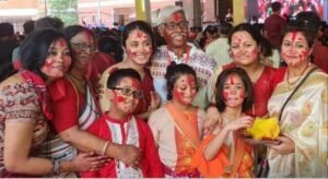 ২) ঢাকায় বিজয়া দশমীতে সিঁদুর খেলার পর স্বজনদের সঙ্গে।
