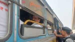 আমাদের ভারত, কলকাতা, ১২ ফেব্রুয়ারি: উত্তপ্ত সন্দেশখালিতে ১৪৪ ধারা জারি আছে। তার মধ্যেই সন্দেশখালি যাওয়ার জন্য বাস চড়ে বিধানসভা থেকে রওনা দিয়েছিল বিজেপি বিধায়করা। তবে কিছুদূর এগোনোর পরই তাঁদের বাসকে আটকে দেওয়া হয়।