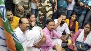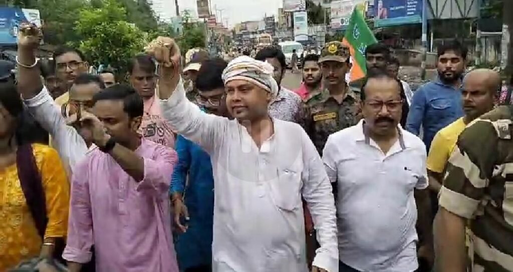 আমাদের ভারত, ব্যারাকপুর, ৩ আগস্ট: গত ৩০ এপ্রিল ব্যারাকপুর গঙ্গোত্রী পাড়া এলাকার বাসিন্দা ব্যারাকপুর সাব ট্রাফিক গার্ডের পুলিশ কর্মী ওঙ্কার বন্দোপাধ্যায়ের সঙ্গে হাতাহাতির ঘটনা ঘটে। এই ঘটনার প্রতিবাদে শনিবার ব্যারাকপুরের নগরপাল কার্যালয় অভিযানের ডাক দেওয়া হয় বিজেপি ব্যারাকপুর সাংগঠনিক জেলার পক্ষ থেকে। ব্যারাকপুর রেল স্টেশন থেকে মিছিল শুরু হয়ে এস এন ব্যানার্জি রোড দিয়ে ব্যারাকপুর বি টি রোড হয়ে নগরপাল কার্যালয় থেকে এগাতে থাকে মিছিল। পুলিশের পক্ষ থেকে ব্যারিকেট দিয়ে মিছিল আটকে দেওয়া হয়, আর সেখানেই হাতে চুড়ি নিয়ে বিক্ষোভ দেখাতে শুরু করেন বিজেপি নেতা ও কর্মীরা। পরে পাঁচজনের প্রতিনিধি দলকে নগরপাল কার্যালয়ে গিয়ে নগরপালের সঙ্গে সাক্ষাতের অনুমতি দেওয়া হয়।