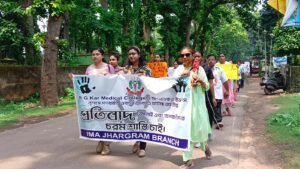 পার্থ খাঁড়া, আমাদের ভারত, ঝাড়গ্রাম, ১৪ আগস্ট: আরজি করের ঘটনার প্রতিবাদে হাতে প্ল্যাকার্ড নিয়ে ঝাড়গ্রামের রাস্তায় নামলো চিকিৎসকরা। বুধবার দুপুরে ঝাড়গ্রাম শহরে ইন্ডিয়ান মেডিক্যাল অ্যাসোসিয়েশনের ঝাড়গ্রাম ব্রাঞ্চের পক্ষ থেকে আরজি কর মেডিক্যাল কলেজের ঘটনার সঙ্গে জড়িত দোষীদের দৃষ্টান্তমূলক শাস্তির দাবিতে এবং এই ধরনের ঘটনা আর যেন না ঘটে তার দাবিতে মৌন মিছিল করা হয়। ঝাড়গ্রাম শহরে অবস্থিত মেডিক্যাল অ্যাসোসিয়েশনের ঝাড়গ্রাম ব্রাঞ্চের অফিস থেকে মিছিল শুরু হয়ে ঝাড়গ্রাম শহর পরিক্রমা করে ঝাড়গ্রাম গভর্মেন্ট মেডিক্যাল কলেজ ও হাসপাতাল চত্বরে শেষ হয়। এদিনের মৌন মিছিলে ঝাড়গ্রামের সরকারি ও বেসরকারি প্রতিষ্ঠানের চিকিৎসকদের পাশাপাশি বিভিন্ন স্তরের মানুষ স্বতঃস্ফূর্ত যোগদান করেন।