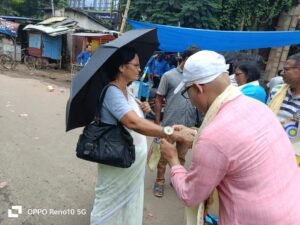পার্থ খাঁড়া, আমাদের ভারত, পশ্চিম মেদিনীপুর, ১৯ আগস্ট: আজ মেদিনীপুর শহর ৫ নং ওয়ার্ড কাউন্সিলরের পক্ষ থেকে শহরের বিধাননগর মাঠে রাখি বন্ধন কর্মসূচি পালন করা হয়। মাঠের সামনে পথচারীদের হাতে রাখি পরিয়ে উদযাপন করা হল সম্প্রীতির রাখি বন্ধন উৎসব। এদিনের এই উৎসবে উপস্থিত ছিলেন ওয়ার্ড কাউন্সিলর মৌ রায়, সমাজসেবী চন্ডী হাজরা, সুকৃতি হাজরা সহ অন্যান্য বিশিষ্ট ব্যক্তিরা। এদিন রাখি পরানোর পাশাপাশি পথচারীদের মিষ্টিমুখও করানো হয়।