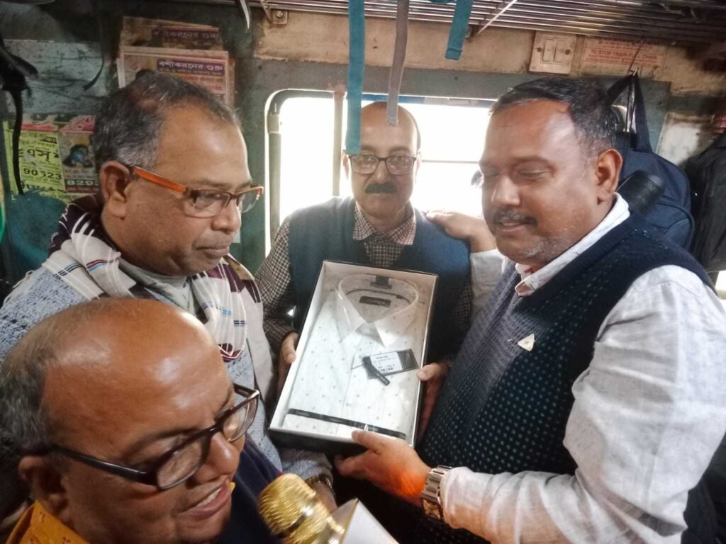 সুশান্ত ঘোষ, আমাদের ভারত, উত্তর ২৪ পরগণা, ২৮ ডিসেম্বর: দেখে মনে হতে পারে কোনও রাজনৈতিক দলের মিটিংয়ে যাচ্ছে। কিন্তু আদৌও না, ঢাকঢোল পিটিয়ে না হলেও, ট্রেনের কম্পার্টমেন্টের অধিকাংশ যাত্রীরাই এগিয়ে এসছেন বিদায় সংবর্ধনা দিতে। হ্যাঁ আগামী ৩১ ডিসেম্বর চাকরি জীবন থেকে অবসর নেবেন বনগাঁ কালীবাড়ির বাসিন্দা অসীম ঘোষ। তারই বিদায় সংবর্ধনা জানালেন তাঁর দীর্ঘ ৩১ বছরের ট্রেনের সঙ্গীরা। ট্রেন কম্পার্টমেন্টের মধ্যেই ফুল মিষ্টি সহ বিভিন্ন উপহার দিয়ে তাকে সংবর্ধনা জানালেন প্রিয় সহযাত্রীরা।