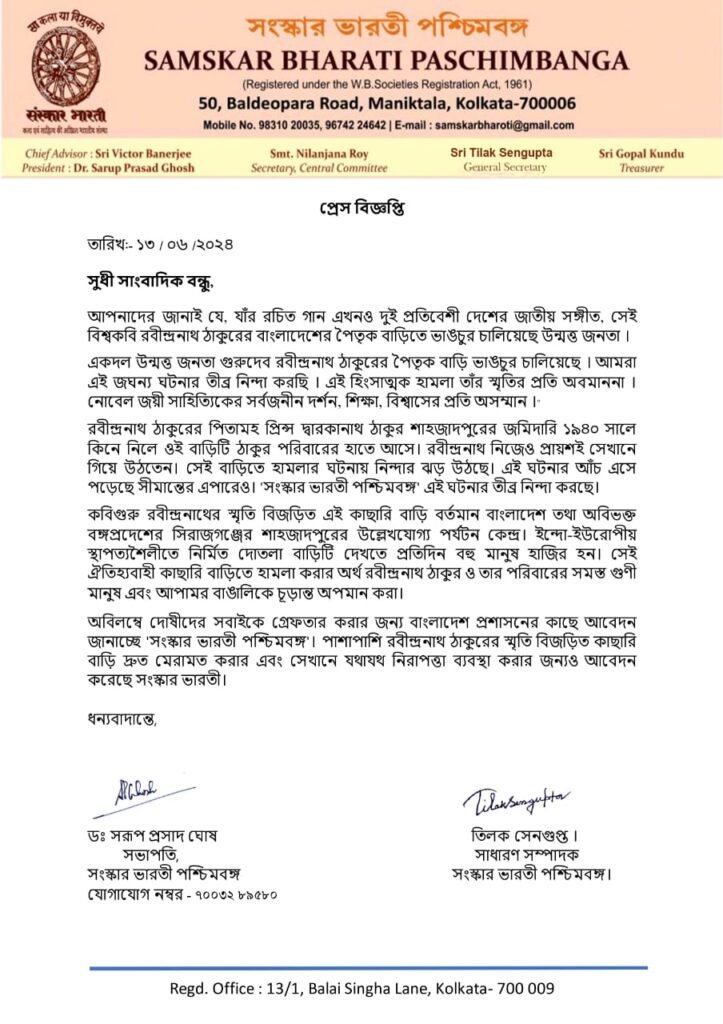 ১৩ জুন, এই মর্মে একটি প্রেস বিজ্ঞত্তি জারি করেছে সংস্কার ভারতী। এই হিংসাত্মক হামলা রবীন্দ্রনাথ ঠাকুরের স্মৃতির প্রতি অবমাননা বলে জানিয়েছে। নোবেল জয়ী সাহিত্যিকের সর্বজনীন দর্শন, শিক্ষা ও বিশ্বাসের প্রতি অসম্মান করা হয়েছে বলেও জানিয়েছে সংস্থাটি।