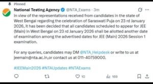 আমাদের ভারত ১৫ জানুয়ারি: পশ্চিমবঙ্গের পরীক্ষার্থীদের জন্য জয়েন্ট এন্ট্রান্স মেন অর্থাৎ JEE (Main) এর প্রথম সেশনে পরীক্ষার দিন পরিবর্তন করল ন্যাশনাল টেস্টিং এজেন্সি। পরিবর্তিত সূচি অনুযায়ী এ রাজ্যে আগামী ২৩ জানুয়ারির পরিবর্তে পরীক্ষা নেওয়া হবে ২৯ জানুয়ারি।