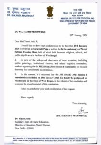 চিঠিতে কেন্দ্রীয় মন্ত্রী লেখেন, ২৩ জানুয়ারি রাজ্যে সরস্বতী পুজো এবং নেতাজি জন্ম জয়ন্তী পালিত হবে রাজ্যজুড়ে। এর ফলে পরীক্ষা কেন্দ্রে পৌঁছতে পরীক্ষার্থীদের সমস্যার মুখে পড়তে হতে পারে। পরীক্ষার্থীদের স্বার্থে এবং পরীক্ষা প্রক্রিয়া নির্বিঘ্নে করতে ওই দিনের পরীক্ষা রিসিডিউল করার অনুরোধ জানান তিনি। তাঁর এই আবেদনের প্রেক্ষিতে এনটিএ দ্রুত পদক্ষেপ করে নতুন নির্দেশিকা জারি করে।