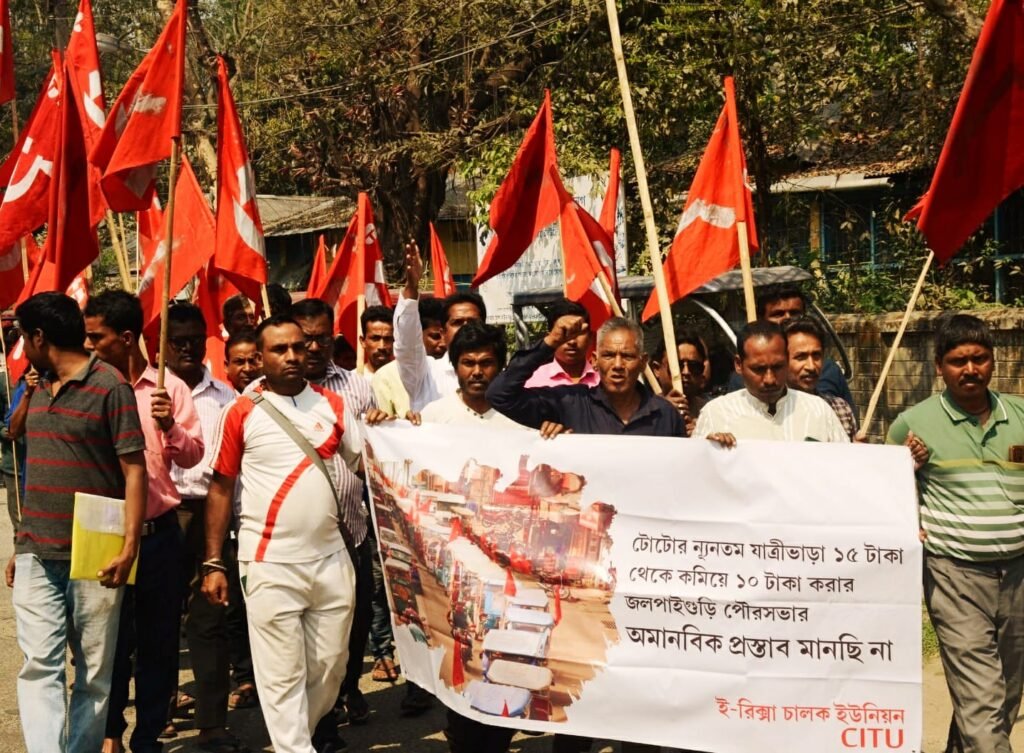 আমাদের ভারত, জলপাইগুড়ি, ১১ মার্চ: টোটোর নূন্যতম যাত্রী ভাড়া ১৫ টাকা ও ৪৪টি টোটো ভেঙ্গে ফেলার অভিযোগ তুলে আন্দোলনে নামল জলপাইগুড়ি সিটু অনুমোদিত ই-রিকশা চালক ইউনিয়ন। সোমবার শহরে মিছিল করে টোটো চালকরা একাধিক দাবি তুলে পুরসভা অভিযানে নামেন। যদিও আন্দোলনকারীদের পুরসভার মূল গেটের সামনে ব্যারিকেড দিয়ে আটকে দিয়েছেন।