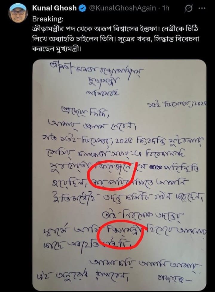 আমাদের ভারত, ১৬ ডিসেম্বর: সাদা পাতায় পদত্যাগ পত্র লিখে মুখ্যমন্ত্রী মমতা বন্দ্যোপাধ্যায়ের কাছে পাঠিয়েছেন অরূপ বিশ্বাস। তাঁর মূল বক্তব্য ছিল, নিরপেক্ষ তদন্তের স্বার্থে তিনি ক্রীড়ামন্ত্রীর পদ থেকে অব্যাহতি চেয়েছেন। অরূপ বিশ্বাসের সেই পদত্যাগ পত্র সোশ্যাল মিডিয়ায় ভাইরাল হয়েছে। কিন্তু সেই চিঠি নিয়ে প্রশ্ন তুলেছেন বিজেপি নেতা তথা কেন্দ্রীয় মন্ত্রী সুকান্ত মজুমদার। অরূপ বিশ্বাসের পদত্যাগ পত্র নিয়ে বিজেপি নেতা তুমুল সমালোচনা করেছেন গোটা তৃণমূল দলের।